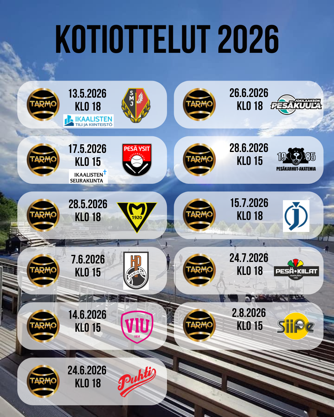 Ikaalisten Tarmon kotikenttä on luonnonkaunis Ikaalisten pesispuisto, jonne aikoinaan rakennettiin Suomen ensimmäinen hiekkatekonurminen pesäpallokenttä. Kesällä 2018 Ikaalisten pesäpallokenttä sai täysin uuden sinisen hiekkatekonurmen. 2020 seura rakennutti uuden pääkatsomon Leader-rahoituksen ja Ikaalisten Säästöpankkisäätiön tuella. Kaudella 2026 Tarmon naiset pelaavat ykköspesistä. Miesten edustusjoukkue on tauolla. Seura panostaa myös juniorityöhön.